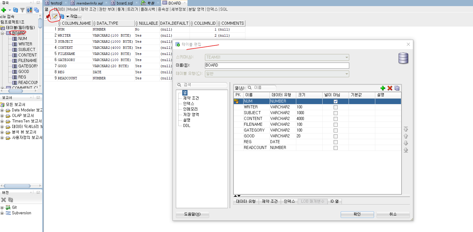 아무튼 여기서 원하는 컬럼을 지울수도 있고 컬럼명을 바꿀 수도 있고 데이터 유형도 바꿀 수 있고 크기도 정해주고 컬럼을 추가할 수도 있고 매우 편하다.